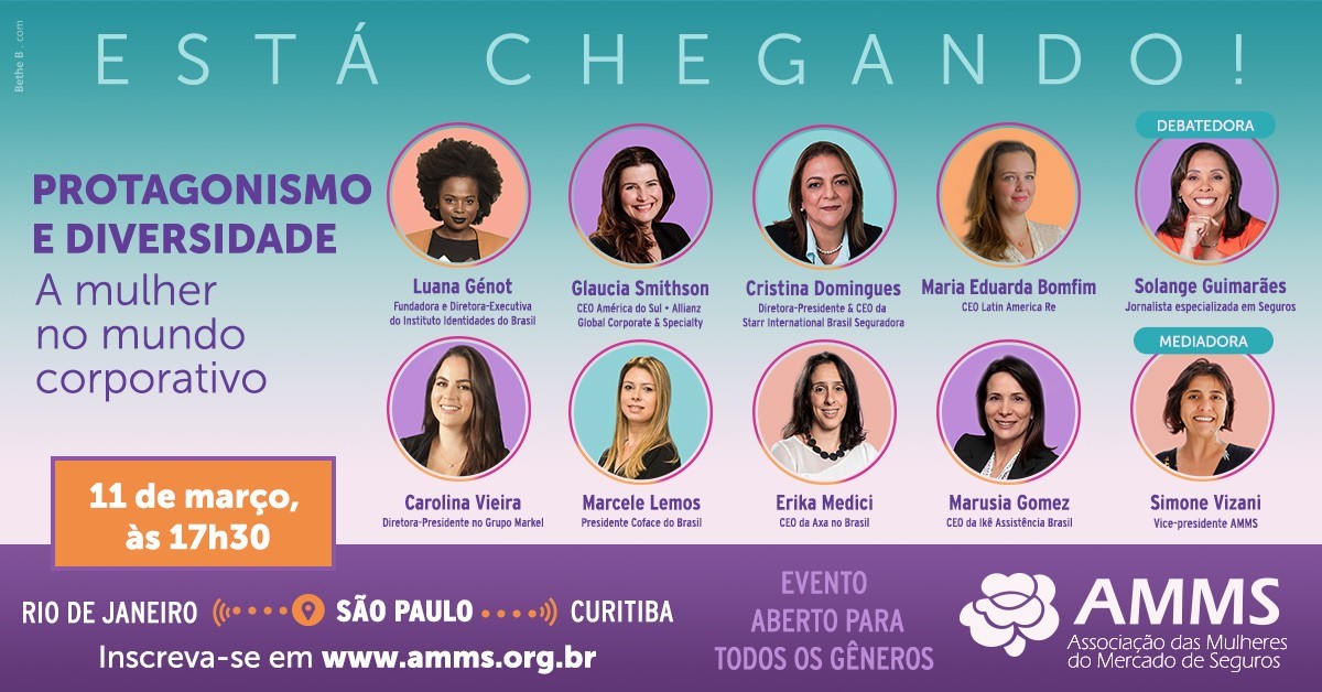 O evento contará com as participações das palestrantes Luana Génot, fundadora do Instituto Identidades do Brasil; e Glaucia Smithson, CEO da Allianz Global Corporate & Specialty South America; Cristina Domingues – diretora-presidente & CEO da Starr International Brasil Seguradora, afiliada brasileira da Starr Companies; Maria Eduarda Bomfim – CEO Latin America Re; Carolina Vieira – diretora-presidente no Grupo Markel; Marcele Lemos – presidente da Coface do Brasil; e Erika Medici – CEO da Axa no Brasil.