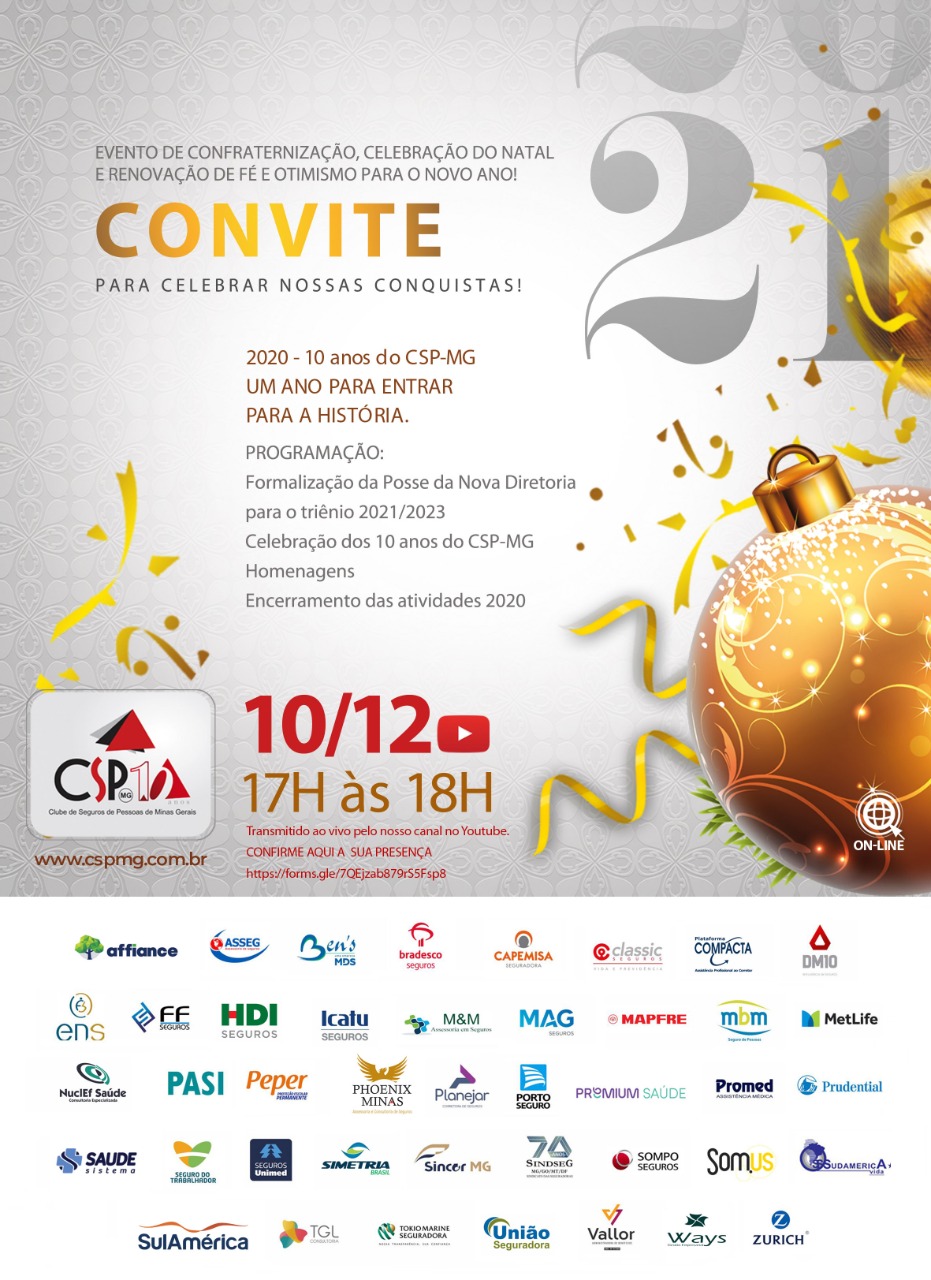 O Clube de Seguros de Pessoas de Minas Gerais (CSP-MG) realizará no dia 10 de dezembro, às 17 horas, o tradicional evento de confraternização de fim de ano e as homenagens a personalidades do mercado. Na oportunidade, também tomarão posse os novos integrantes da diretoria.