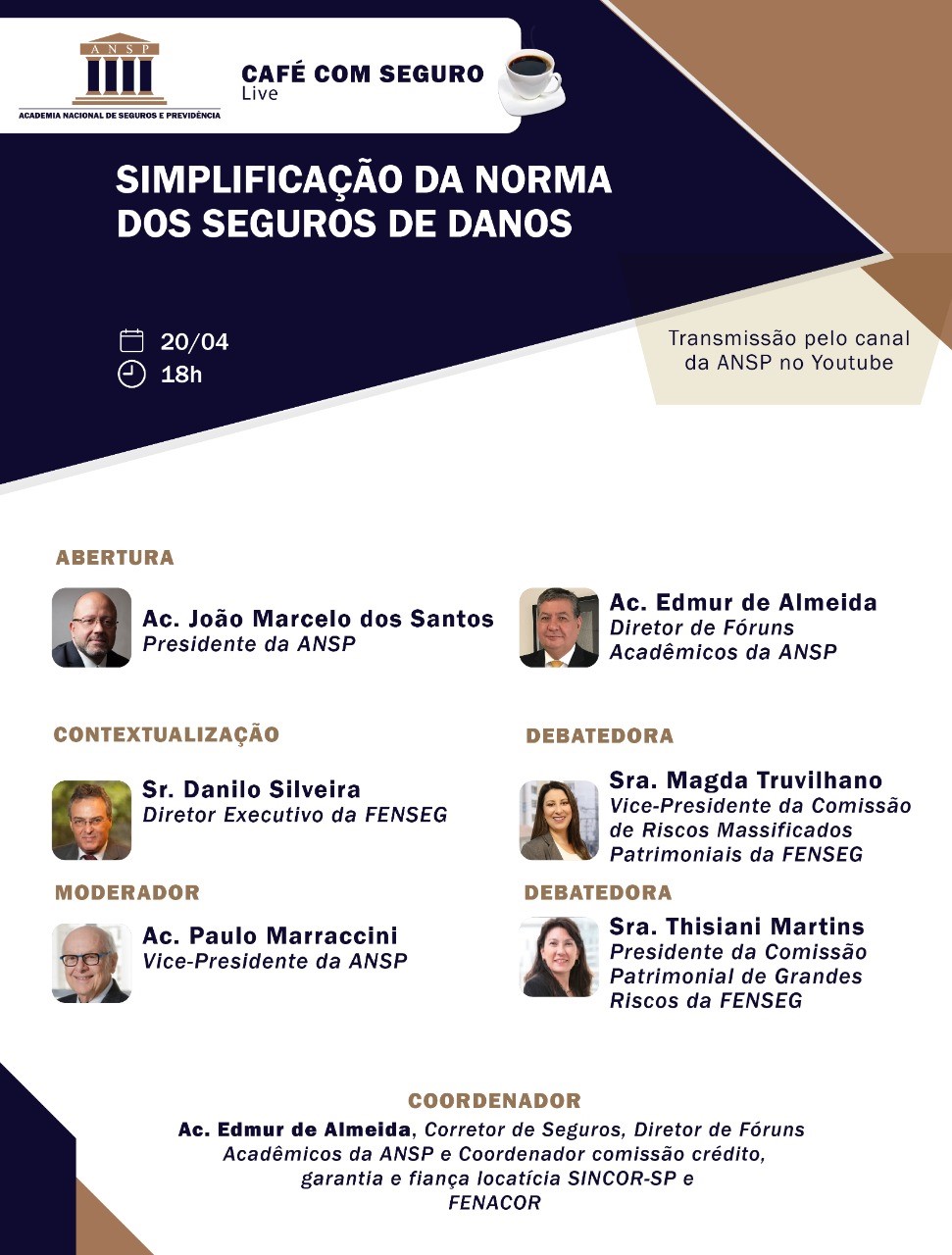 No próximo dia 20, às 18h, a Academia Nacional de Seguros e Previdência – ANSP realizará mais um Café com Seguro Live que abordará o tema Simplificação da Norma dos Seguros de Danos. O evento será transmitido pelo canal da Academia no Youtube.