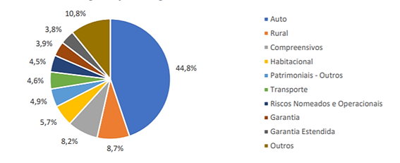 Em termos de arrecadação de prêmios, os seguros de automóvel representaram 44,8% do mercado de seguros de danos no Brasil, em 2020. Trata-se da modalidade de seguros mais “popular” no país, que gerou uma receita de R$ 35,34 bilhões no ano passado, frente aos R$ 78,86 movimentados pelo segmento de danos. Veja abaixo o gráfico com a participação do ramo no segmento, de acordo com os dados de 2020.