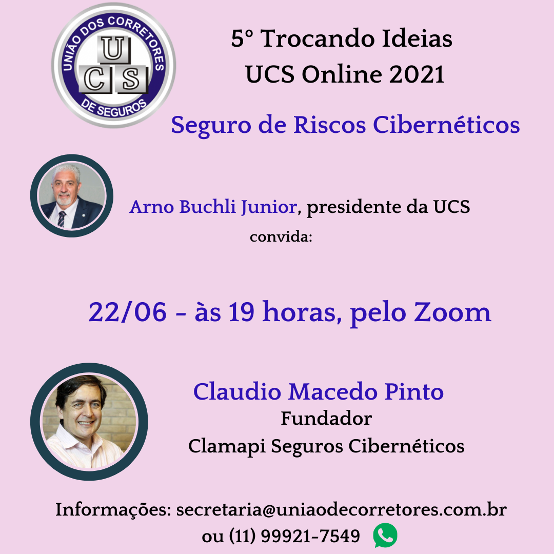 No dia 22 de junho, terça-feira, a partir das 19h, a UCS – União dos Corretores de Seguros – realiza seu 5º Trocando Ideias Online de 2021. O corretor de seguros Claudio Macedo Pinto, fundador da Clamapi, a primeira corretora do Brasil especializada em seguros de riscos cibernéticos, irá abordar como os riscos digitais podem afetar os negócios dos corretores de seguros e as oportunidades de comercialização.