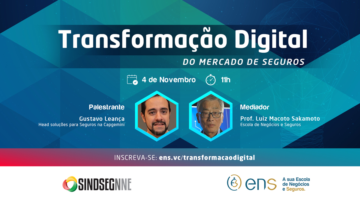 Com apoio do Sindicato das Seguradoras Norte e Nordeste (Sindsegnne), a Escola de Negócios e Seguros (ENS) promove, no dia 04 de novembro, às 11h, evento on-line para debater a transformação digital no mercado segurador. As inscrições são gratuitas e podem ser realizadas pelo site ens.vc/transformacaodigital.