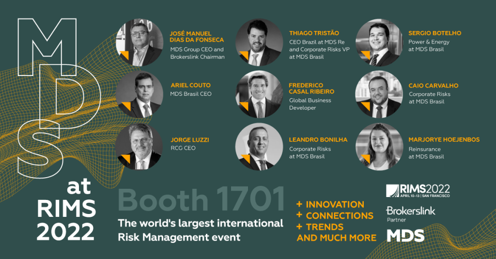Executivos da companhia estarão concentrados no Espaço Brokerslink, no stand 1701, para falar sobre as principais ferramentas, programas e novidades do mercado de gestão de risco. Entre os líderes, destacam-se José Manuel Dias da Fonseca, CEO do MDS Group e Chairman da Brokerslink; Jorge Luzzi, CEO Global da RCG; Ariel Couto, CEO da MDS Brasil e Americas Regional Manager da Borkerslink; Thiago Tristão, Vice-presidente de Riscos Corporativos da MDS Brasil e CEO da MDS Reinsurance Solutions; Frederico Casal-Ribeiro, Global Business Developer, Caio Carvalho, Diretor de Riscos Empresariais da MDS Brasil; Leandro Bonilha, Diretor de Riscos Corporativos da MDS Brasil; Marjorye Hoejenbos, Diretora de Resseguros da MDS Brasil; e Sergio Botelho, Diretor de Power e Energy da MDS Brasil.