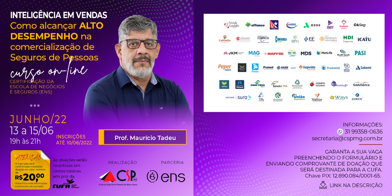 O novo curso on-line de capacitação, promovido pelo Clube de Seguros de Pessoas de Minas Gerais (CSP-MG), de 13 a 15 de junho, utilizará o conceito de inteligência em vendas para ajudar os corretores de seguros a produzirem mais e melhor, formando uma carteira rentável no ramo de Seguros de Pessoas.