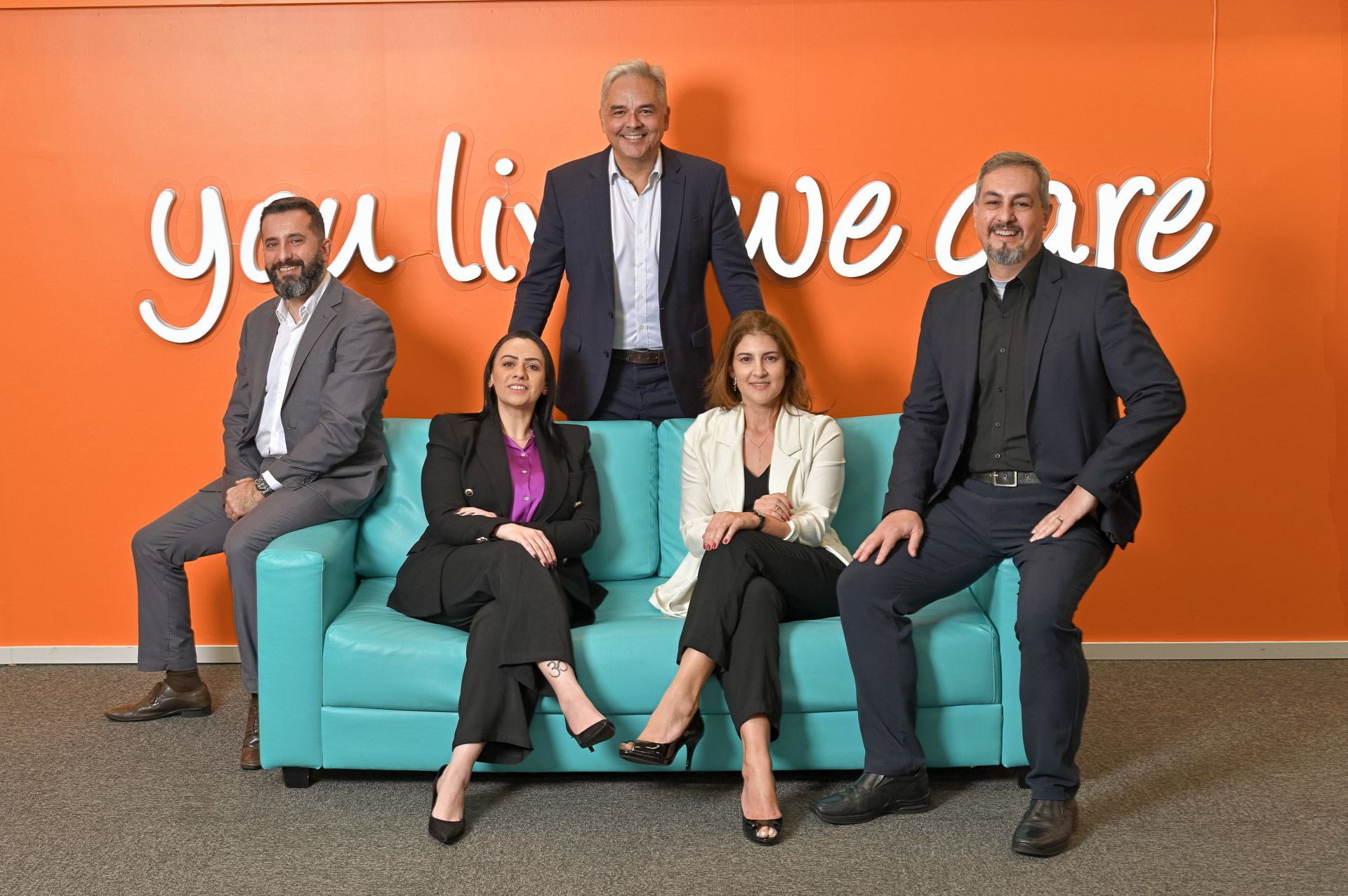 Legenda da foto: Da esquerda para direita: Renato Chama (Especialista de Negócios) Vivian Moreira (assistente Administrativa de Contas), no centro Gabriel Rego (Head de Travel), Cleudes Amorim (Especialista de Contas) e Alexandre Zaparoli (Especialista de Negócios).