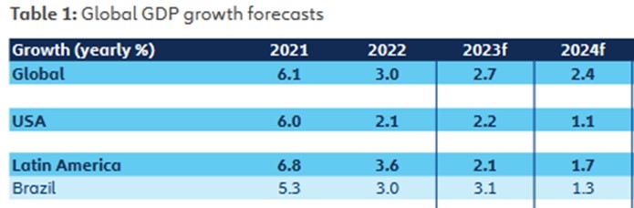 No geral, os economistas preveem que o crescimento global do PIB diminuirá para +2,7% em 2023 e +2,4% em 2024, ficando abaixo dos níveis de 2019. No Brasil, espera-se uma taxa de crescimento de 3,1% para este ano, apenas 0,1% maior do que em 2022.