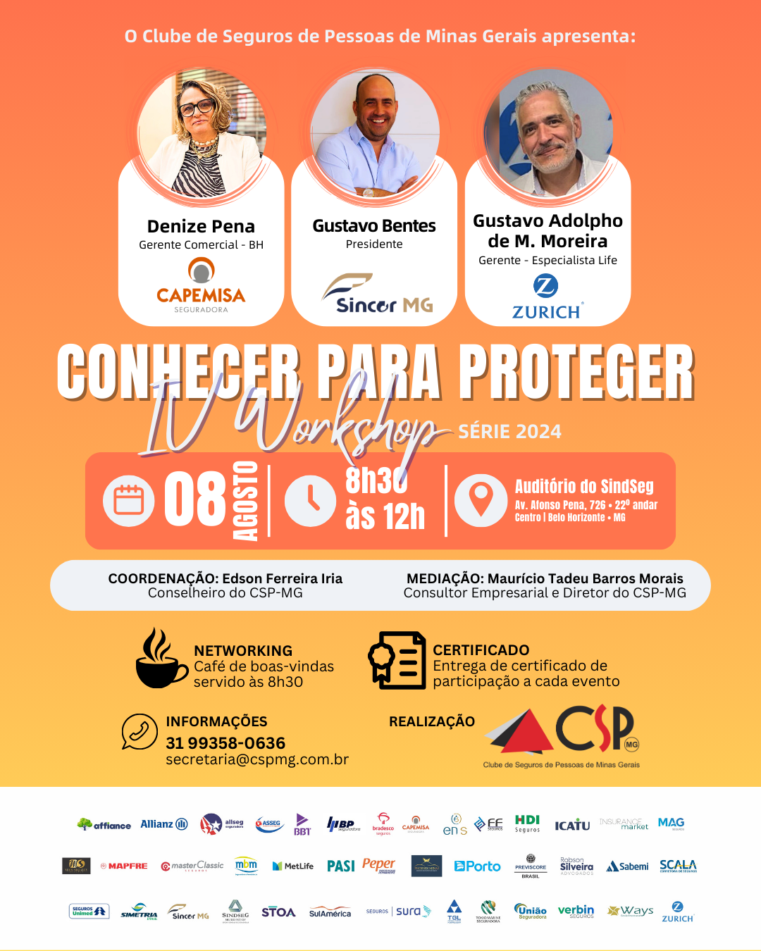 O Clube de Seguros de Pessoas de Minas Gerais (CSP-MG) recebe, no dia 8 de agosto, as mantenedoras CAPEMISA Seguradora e Zurich, além do Sincor-MG (benemérita honorária) no IV Workshop Conhecer para Proteger, que será realizado no auditório do SindSeg MG/GO/MT/DF, em Belo Horizonte.