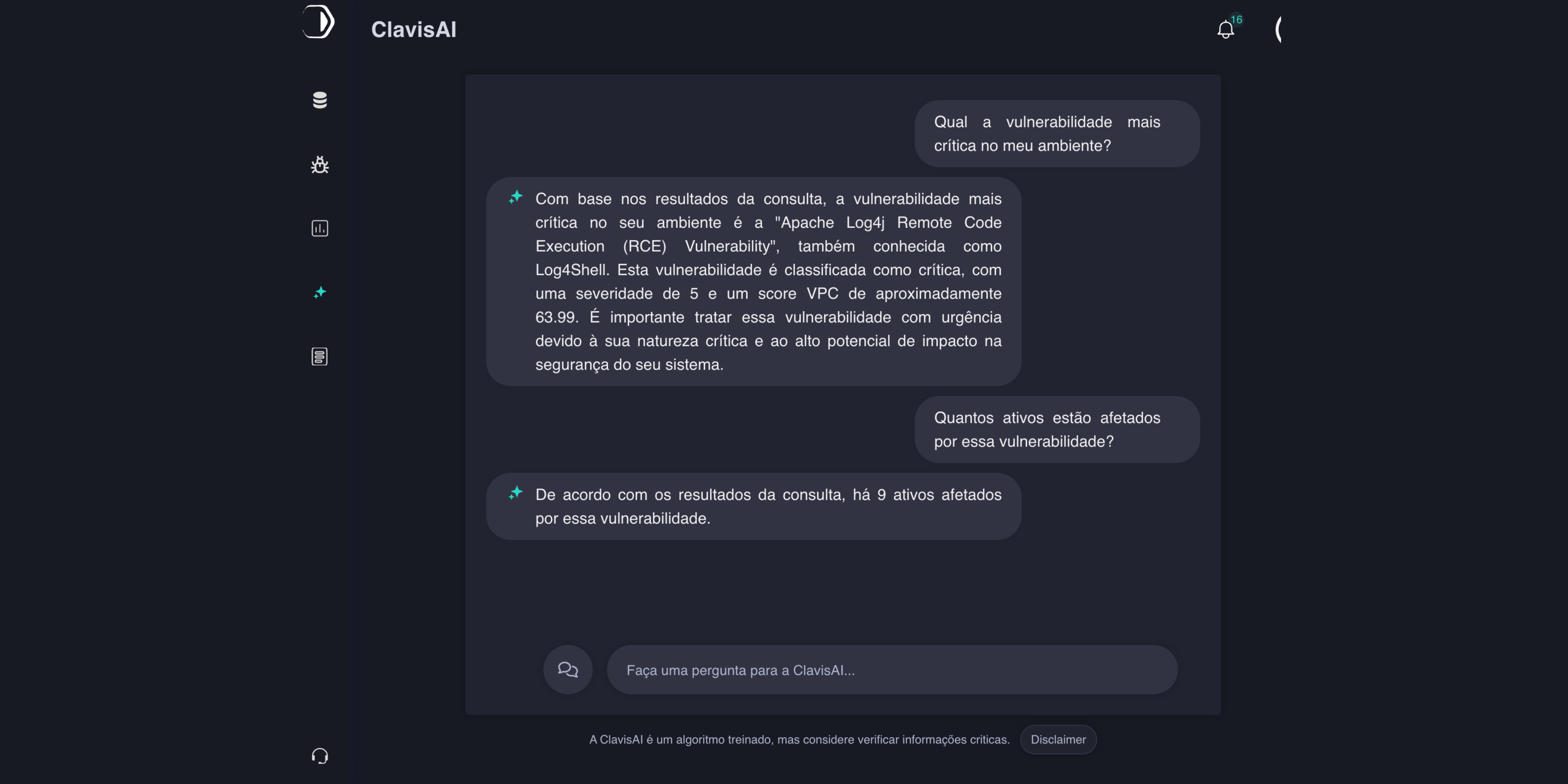 Além disso, a Clavis AI está projetada para entender perguntas dos usuários e fornecer respostas relevantes, tornando o processo de gestão de vulnerabilidades mais prático. O lançamento está disponível para os clientes que utilizam o modelo SaaS. A interação com o novo módulo de Inteligência Artificial é bastante simples e acessível, garantindo ao usuário suporte sempre que precisar.